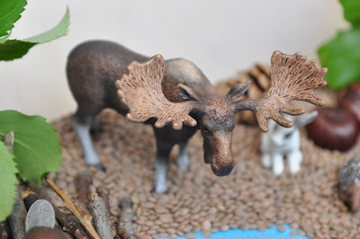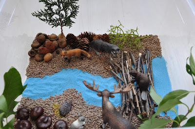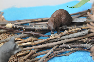 Сделать бобровую плотину из палок и создать лес с животными вокруг него. Потребуются такие ингредиенты: чечевица, синий песок, палочки, каштаны, желуди шапки, сосновые шишки, листья и игрушечные животные.