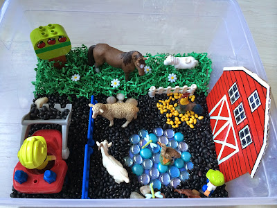 Мы уже делали сенсорный бункер фермы один раз, но это был огород в качестве основной темы. Здесь я хотел бы сосредоточиться на домашних животных. Во-первых, я попросил мою дочь назвать всех животных в бункере. Тогда я сказал ей, почему они живут на ферме: корова и коза дают молоко, курица откладывает яйца, овца дает шерсть и т.д. После этого, я назвал всех детей животных - жеребенок, теленок, ягненок, цыпленок. Я взял книгу "Старый Макдональд имел ферму" и мы пели обо всех животных, которых мы знали.