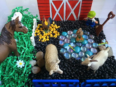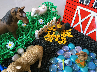 Я открыл "My Big Book Animal" на странице с сельскохозяйственными животными и пусть моя дочь найдёт животных, которые мы имели в бункере на изображениях. Большая часть была игра с петухом. В то время как клюнул семена (желтые цветные бобы), я бросил пару черных бобов. Петух был не рад, надо выплюнуть их. Моя дочь смеялась над этим, и мы повторили несколько раз. Ингредиенты: черные бобы, желтые цветные бобы, зеленая измельченная бумага, мраморная и синяя цветная бумаги. Я нарисовал дом на кусок картона с акрилом. Джерело: http://funprojectsforyourkids.blogspot.com/2015/05/farm-sensory-bin.html | |