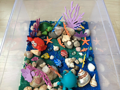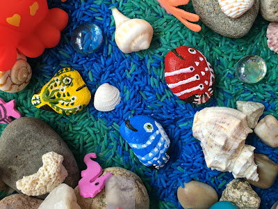 Коралловый риф - наша следующая живая среда обитания. Я вырезал кораллы из пористой бумаги и мы наполнили бункер двумя оттенками синего цвета риса. Я нашел идею живописи рыбы на камнях. Я взял три камушка, покрасил их в желтый цвет, нарисовал на них голубой и красной краской рыбы. Мы играли с морской флорой и фауной с использованием воды в бункере. Играли много раз, поэтому я решил держаться подальше от воды. Я думал, что моя дочь будет изучать кораллы и ракушки ближе, если она не будет отвлекаться в воде. Я сказал ей, что кораллы живут под водой и что большинство морских существ живут вокруг них. Мы попытались вспомнить всех морских животных, которых мы знали, а потом она просто играла с рисом и рыбой. Она также прятала ракушки в рисе. Джерело: http://funprojectsforyourkids.blogspot.com/2015/05/coral-reef-sensory-bin.html | |